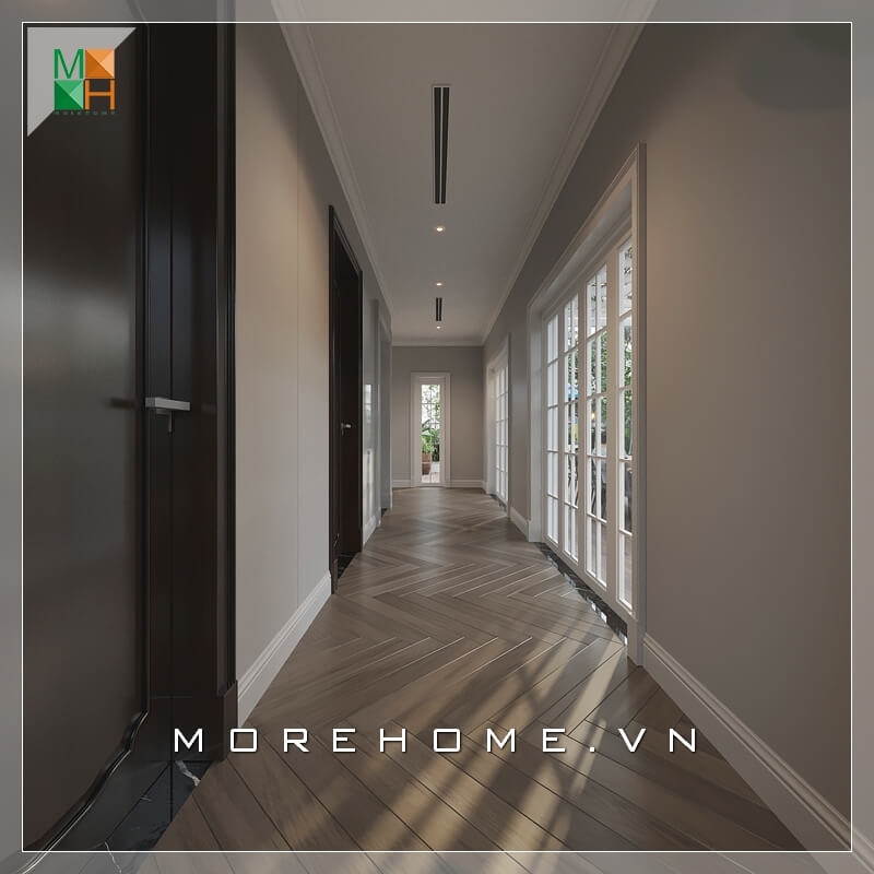 Thiết kế hàng lang biệt thự, nhà phố đón ánh sáng trực tiếp thông qua cửa kính thoáng đãng, hiện đại và sang trọng.