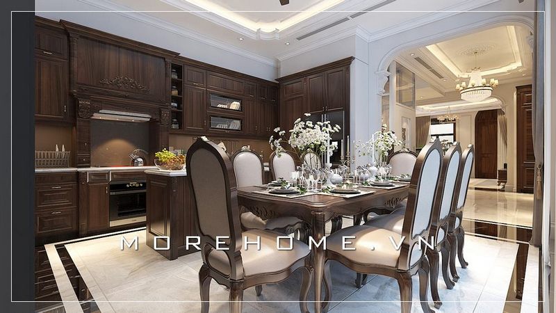 Mẫu bàn ăn tân cổ điển gỗ tự nhiên sang trọng cho phòng bếp ăn biệt thự
