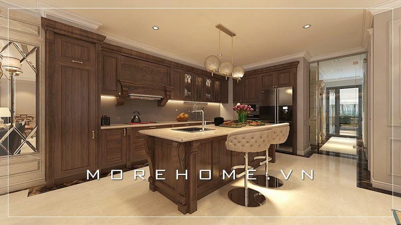 Thiết kế nội thất phòng bếp biệt thự gỗ tự nhiên phong cách tân cổ điển sang trọng tạo cảm giác ấm cúng và thoải mái cho gia chủ