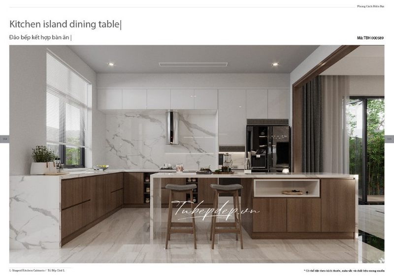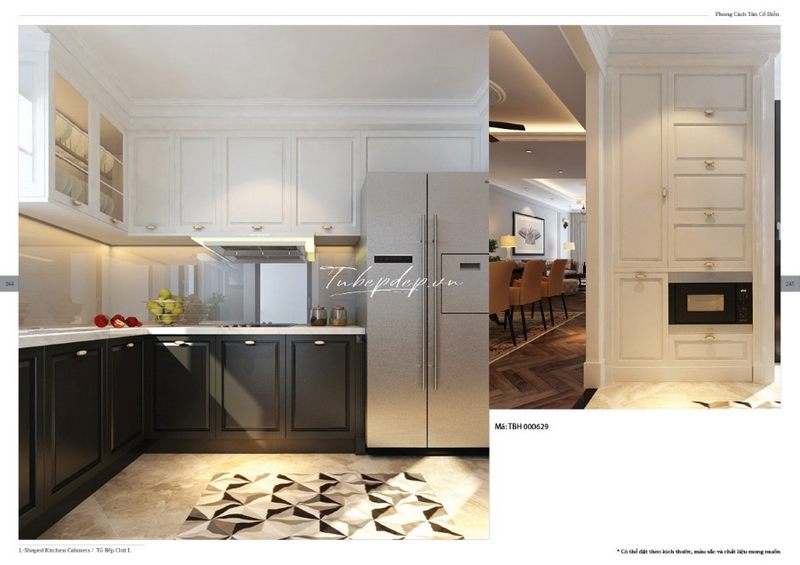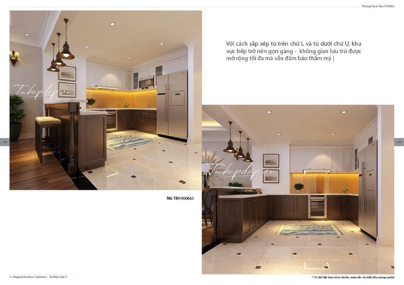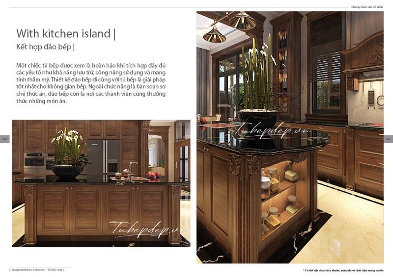 Mê mẩn mẫu thiết kế phòng bếp tân cổ điển kết hợp sáng tạo giữa tủ bếp chữ L trên và tủ dưới chữ U từ gỗ óc chó vừa sang trọng lại tiết kiệm không gian, cất trữ được nhiều đồ hơn