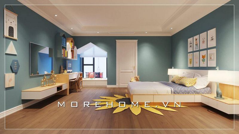 Thiết kế nội thất phòng ngủ trẻ em hiện đại, phần tủ kệ decor hay tranh treo tường tạo nên sự độc đáo, ấn tượng và thích thú hơn cho các con