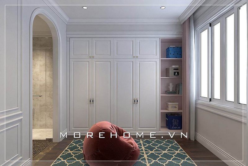 Tủ quần áo với thiết kế kệ trang trí sơn trắng và tay nắm đẹp, sang trọng sẽ làm nên phong cách tân cổ điển cho phòng ngủ của bé.