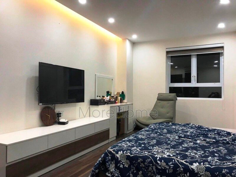 Việc thi công kệ tivi gỗ công nghiệp cho phòng ngủ hiện đại tại Chung cư Thăng Long Number One đang được thực hiện.